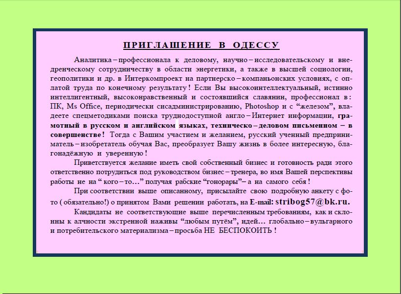 Гість stribog57 Опубліковано 13 березня, 2013 Опубліковано 13 березня, 2013 Приглашение в Одессу аналитика–профессионала в ПК, высшей социологии, геополитики в Интеркомпроект, не склонного к алчности экстренной наживы “любым путем”, идей... глобального–вульгарного материализма.