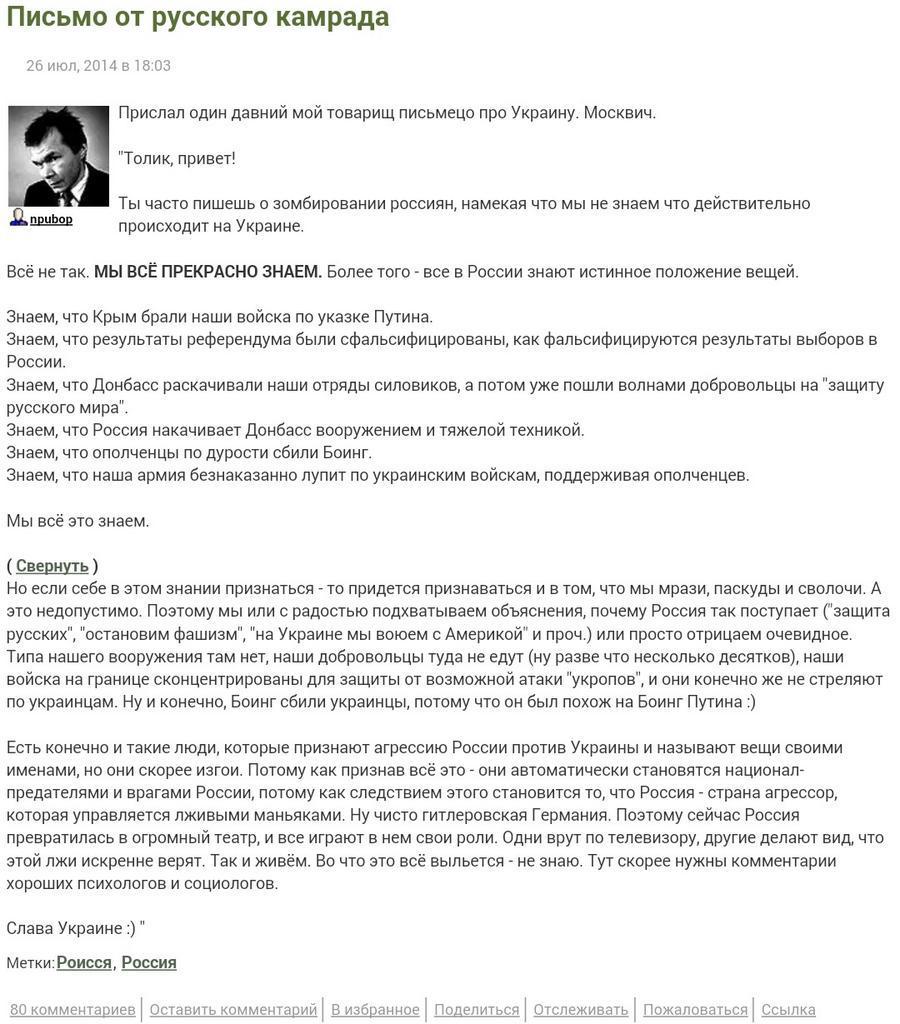Androh Опубліковано 27 липня, 2014 Опубліковано 27 липня, 2014 вот кстати интересненькое письмо думаю осень хорошо объясняет что происходит https://pbs.twimg.com/media/BtidEFZIAAAf94i.jpg:large Я не помню кто сказал в интервью но смысл примерно такойМЫ ПОТИХОНЬКУ ВЕРНУЛИСЬ В СЕМИДЕСЯТЫЕ - КОГДА О ПРОБЛЕМАХ ШЕПЧИМСЯ В ТИХУЮ НА КУХНЯХ..... это сказала москвичка но не помню кто --- просто запомнил слова ....