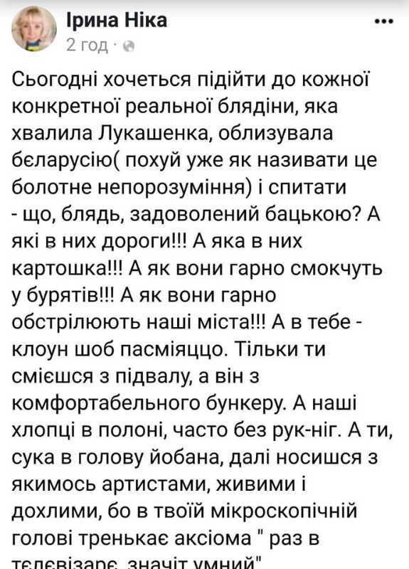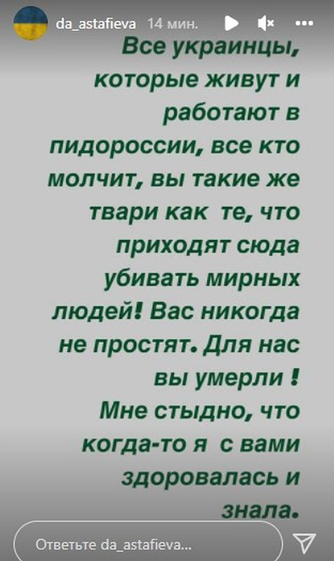 Radiola Опубліковано 24 липня, 2022 Поділитися Опубліковано 24 липня, 2022 Там, де всередині мене раніше була російська, сьогодні я відчуваю мертвого звіра, який смердить і розкладається. (Ія Ківа) Посилання на коментар Поділитись на інших сайтах Поділитися