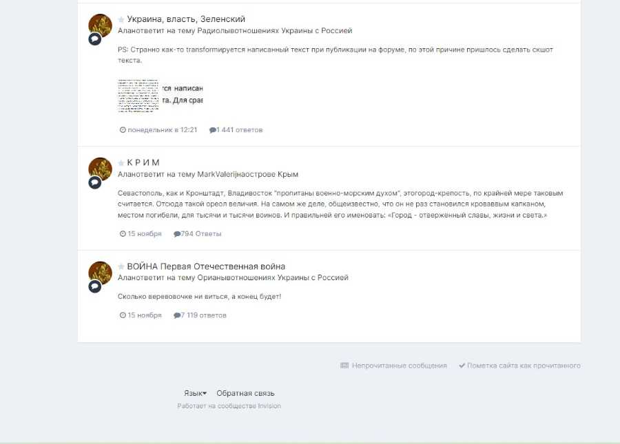 Алан Опубліковано 25 листопада, 2022 Опубліковано 25 листопада, 2022 1 годину тому, Radiola сказав: Можно было написать вместо Зеленского — ППА, это не изменит сути. Почему бы нет? - есть возможность: вы можете найти свои сообщения двумя способами. Один находится непосредственно в соответствующей теме, если вы помните его название. Но если вы не помните, то способ номер два — искать свои сообщения в профиле. К сожалению мои посты за 2014 год вовсе отсутствуют, видимо форум "форматировался". В профиле можно видеть только недавние сообщения: