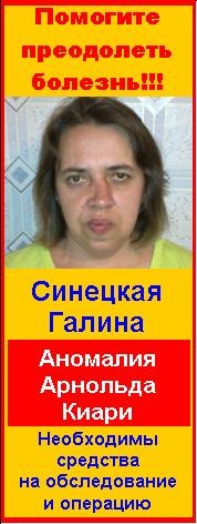Гість bobr333 Опубліковано 18 травня, 2012 Опубліковано 18 травня, 2012 Здравствуйте, меня зовут Синецкая Галина Александровна, мне 48 лет. Живу на Украине, Луганская обл, г. Лисичанск, ул. Шушенская, д.22, индекс 93110. Мне очень стыдно просить о помощи, но нет другого выхода. В июле прошлого года мне поставили диагноз Аномалия Арнольда Киари 1ст., внутренняя гидроцефалия. Моя семья состоит из 3чел. - сын Дима13лет, муж Иван 49лет и я. Мы с мужем состоим на учёте в тубдиспансере, поэтому найти хорошую работу для нас нереально, с таким диагнозом все шарахаются, как от чумы. Сразу я лечиться не стала, т.к. нет денег. Сейчас моё состояние очень тяжёлое - постоянные головные боли, резко ухудшилось зрение, нарушена координация движений, отнимаются и отекают руки и ноги, иногда могу "сходить" в туалет под себя. Очень стыдно, но это так... Обратилась в киевскую клинику к врачам-нейрохирургам за консультацией. Нейрохирург Золотоверх Александр Михайлович (его тел.+380979875827) ответил, что состояние крайне тяжёлое, нужно срочно ехать на обследование и операцию. Я попросила хоть приблизительный счёт на оплату медицинских услуг, на что он ответил так: "Для проведения обследования вам нужно иметь при себе примерно 5000грв = 18500руб., а стоимость операции будет зависеть от результатов обследования. Я очень прошу Вас помочь мне в сборе этой суммы, я очень плохо себя чувствую, как бы Дима не остался без мамы... Нам эту сумму не по силам собрать, я не работаю по состоянию здоровья, муж работает ночным сторожем, з/п 33грв/смена. Другие вопросы можно уточнить у доктора или позвонив мне +380666734784. Реквизиты Яндекс кошелёк 410011379980839 Кошельки на Webmoney WMR 299476561778 WME 342390702568 WMU 576132201419 WMZ 113017814968 Счёт в банке: Банк отримувача:АТ"Райффайзен Банк Аваль" МФО 304007 Отримувач:Синецька Галина Олександрівна ідентифікаційний код отримувача 2345712523 р/р отримувача 2625542641 Призначення платежу:Поповнення рахунку 0783429100 П.І.Б.отримувача Синецька Галина Олександрівна. Банк корреспондент: ОАО"АЛЬФА-БАНК",г.Москва БИК:044525593 Корреспондентский счёт 30101810200000000593 ИИН ОАО"Альфа-Банк"7728168971 Банк Получателя: ПАО "АЛЬФА-БАНК",г.Киев Корреспондентский счёт 30111810300000000199 Получатель Для зачисления на счёт "Райффайзен Банк Аваль",г.Киев,номер 16001000015004 В пользу СИНЕЦЬКА ГАЛИНА ОЛЕКСАНДРIВНА (фамилия имя отчество клиента),номер 0527,номер 262012441207. Большое спасибо всем неравнодушным людям!!!Счастья и здоровья Вам и Вшим близким! 04.05 +285 руб на ЯК 05.05 +150 руб на Веб Мани 05.05 +500 руб на ЯК Итого на 05.04 собрано 935 руб Остлось собрать 17565 руб. Я очень прошу всех,кто неравнодушен к чужому горю-пожалуйста,помогите мне собрать нужную сумму,чтобы поскорее вылечиться! Моё состояние стремительно ухудшается,я уже не могу стоять на ногах без поддержки... Очень прошу,помогите!!! 08.05+200руб.на ВМ кошелёк. Спасибо!!! На 08.05.2012 собрано 1135 рублей. Осталось собрать 17365 рублей. 10.05. + 1000 рублей на яндекс кошелек. Большое спасибо!!!!Дай Бог Вам здоровья и счастья!!! На 10.05.2012 собрано 2135 рублей. Осталось собрать 16365 рублей. 12.05 +100 руб. 13.05 + 2000 руб на ЯК. 14.05 +50 грвн на карту банка. (примерно 185 руб) 14.05 +200 руб на ЯК. На 14.05 собрано 4620 руб. Осталось собрать 13880 руб. Большое всем спасибо!!! 15.05 +700 руб.на як 15.05 + 42.5 руб на як Итого на 15.05 собрано 5362.5 руб (1 421 украинской гривны). Осталось собрать 13137.5 руб. (3 481 украинской гривны).